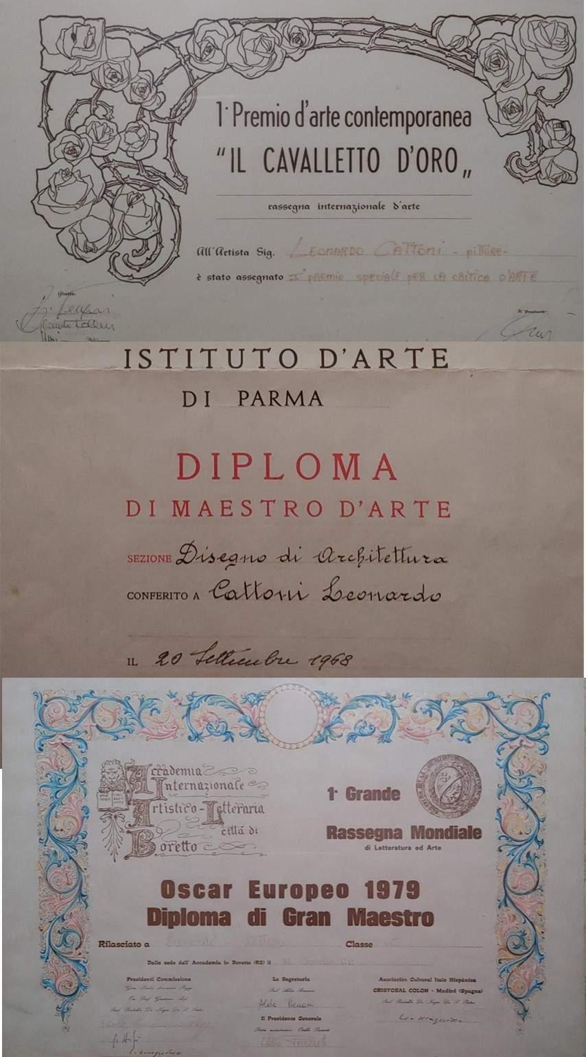 Cattoni Leonardo è nato a Sarzana (SP) il 15 Aprile del 1940. Formatosi culturalmente al liceo Artistico di Carrara e all’Istituto d’Arte di Parma, si è abilitato all’insegnamento dell’Educazione Artistica nella città di Genova. Ha insegnato nelle Scuole Medie Inferiori della Provincia di La Spezia, Varese Ligure, Sesta Godano, Ceparana, Vezzano Ligure, Castelnuovo Magra, Marinella, Sarzana – Collegio Missioni – Scuola Media N.2, poi Poggi-Carducci, Arcola e Romito da dove è andato in pensione. Sino al 1980 ha partecipato a concorsi e mostre dove ha riscosso importanti riconoscimenti che hanno fatto sì che il suo nome fosse citato su prestigiose pubblicazioni d’Arte. In seguito ha preferito lavorare nell’ombra pur rimanendo sempre attento e sensibile a tutte le problematiche che hanno per protagonista il dramma umano e ambientale. Con la sua creatività ha saputo dar vita ad ogni sorta di materiali: sassi, radici, cortecce, ossi di seppia, da cui ha ricavato autentici capolavori. Il suo tratto deciso ed immediato lo ha portato a prediligere il disegno e l’acquerello. Nel cromatismo ha sempre manifestato una preferenza per le tinte calde, ma non aggressive. Profondo è sempre stato il suo amore per la città natale “Sarzana” che manifestava favorendo tutte le iniziative che ne mettessero in luce i suoi aspetti storici e culturali senza escludere usi e costumi. Comunicativo, sapeva instaurare rapporti d’amicizia con tutti basati sulla schietta sincerità e corredata di gesti di generosità. Questa sua personalità ha fatto sì che fosse stimato ed amato anche nell’ambito scolastico sia dai colleghi che dagli allievi che ancora ricordano con gioia il “Librone” che faceva creare a ciascun di loro. Per lui era fondamentale non tanto creare degli artisti quanto formare degli amanti dell’arte. I suoi ragazzi erano felici di disegnare perché lasciava loro una libera creatività che partiva dallo “scarabocchio”. Nell’ambito famigliare è stato un marito che ha saputo sempre stimare e valorizzare la “sua donna”; è stato un padre amorevole che ha sempre sentito in modo profondo il suo ruolo di padre, figura che a lui è mancata nella sua vita.
